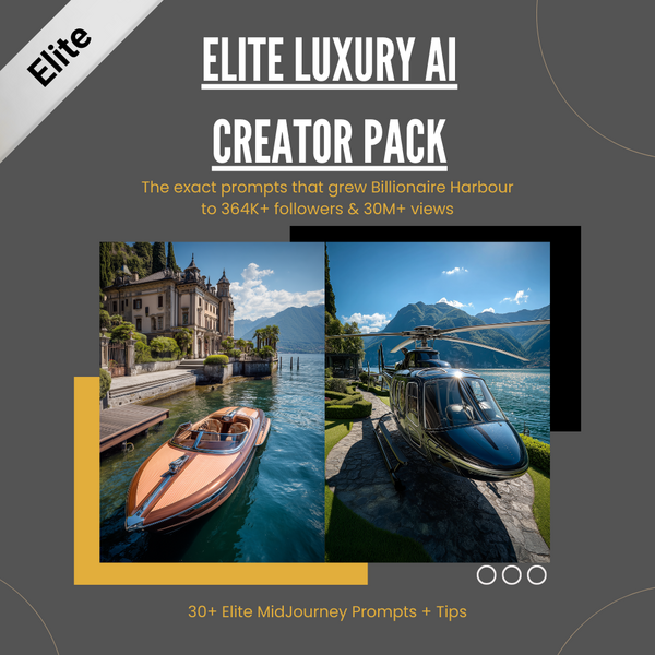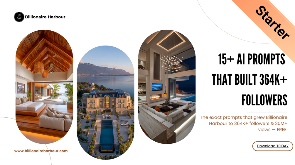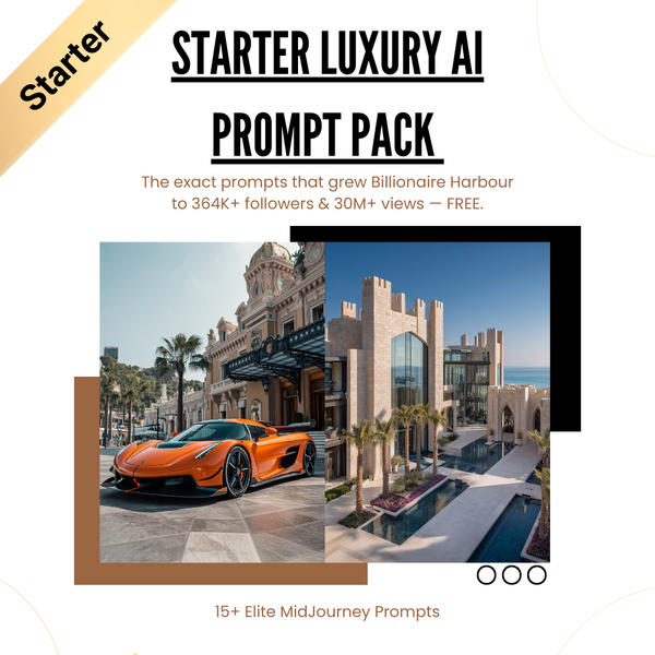 The perfect entry point into AI-powered content creation. This Starter Pack gives you 15 curated MidJourney prompts designed across Mansions, Interiors, Cars, Yachts, and Lifestyle scenes.